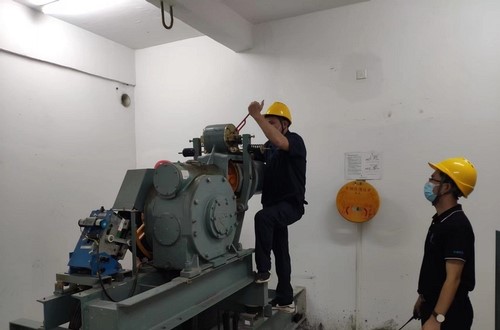 演练按照电梯应急预案中电梯故障悬停,有乘员被困电梯内进行。值班人员接到被困人员求救电话后,第一时间通知工程和维保人员抵达事故现场开展救援。另一组维保人员来到电梯机房控制间,在控制间里开展松闸盘车作业,及时调整轿厢到达平层位置,5分钟左右电梯恢复正常运行,被困人员被成功救出。