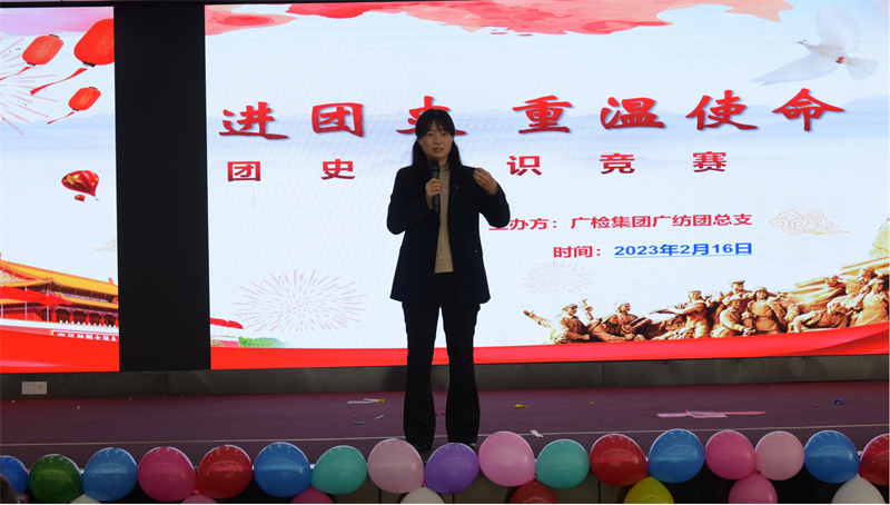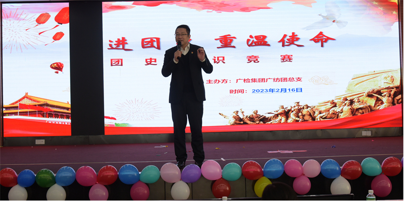 为深入学习贯彻习近平总书记在庆祝中国共产主义青年团成立100周年大会上的重要讲话精神,激发团员青年的学习意识,提高团员青年的责任意识,展现团员青年的多样风采,2月16日,广检集团广纺团总支在番禺园区会议中心开展了“走进团史 重温使命”团史知识竞赛活动。广检集团广纺党委委员、广纺纪委书记汪朝红,广检集团团委书记、办公室(董监办公室、人民武装部)高级经理余俊毅出席了本次活动。